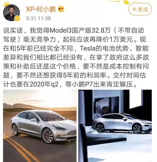 他在社交媒体上说,特斯拉这个价格没有竞争力,等小鹏P7出来可以碾压特斯拉。而实际上小鹏P7距离何小鹏对外宣称的量产时间还要一年多,即便一切顺利,比特斯拉Model 3宣布的量产时间也要至少晚上半年,单就量产交货时间来说,小鹏汽车就没有任何优势。