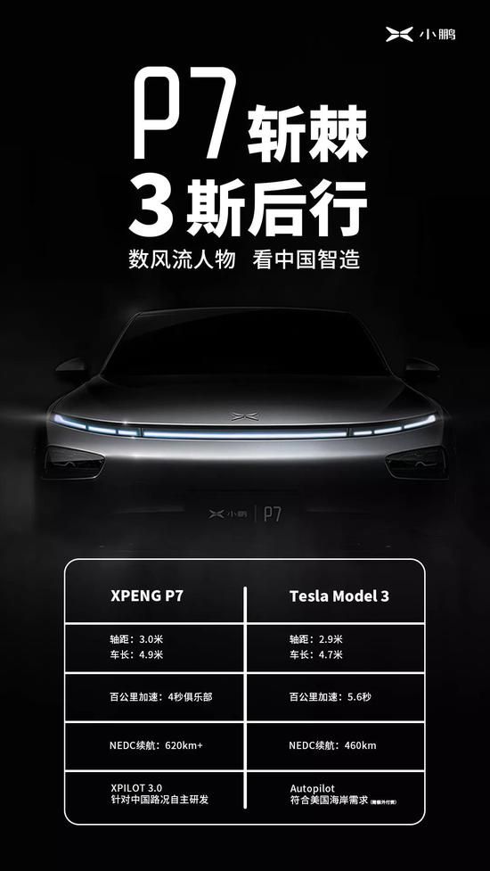 何小鹏还表示,小鹏P7的续航能力目标是640km,远超特斯拉Model 3的460km。更有意思的是,小鹏汽车还发布了一张具有挑衅意味的宣传海报,上面写着“P7斩棘,3期后行”,另有一段小字为“数风流人物,看中国智造”……明晃晃地博眼球。
