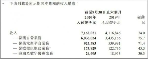 再看另外一家上市企业平安好医生。三者业务较为相似,在医药电商、互联网医疗、消费医疗、智慧医疗等领域均有布局,主要营收也均来自于医药电商。