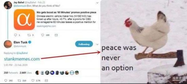 面对CBS将蔚来定义为“特斯拉杀手”的消息,马斯克在节目播出当天,用一张图对此做了回应,图中一只鸡站在了一把斧头上,还配以文字“和平从来都不是一个选项”(Peace was never an option)。这一举动被业内看作是特斯拉已经意识到了来自蔚来的威胁。这时距离特斯拉上海超级工厂动工刚一个月,主力车型Model 3的预定起售价还是355,800元。