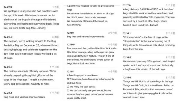 代码里面没有 bug 似乎不太可能,翻阅 Yelp 的版本更新历史记录,你会发现这简直是一部“除虫史诗”,你们感受一下: