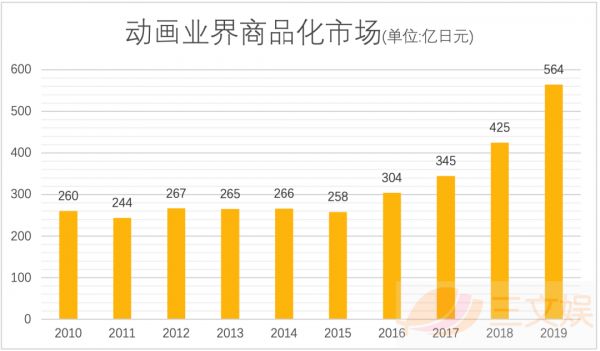 可以说《鬼灭之刃》以一己之力助推了2019年动画业界市场(狭义的动画市场)中的商品化市场同比大幅增长32.7%,达到约35.6亿元(564亿日元)。