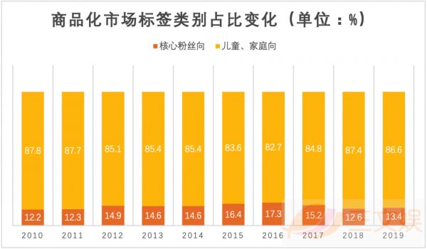 2019年日本的动画商品化市场, 儿童、家庭向占商品市场占了总体的86.6%。核心粉丝向商品市场份额为13.4%,与上年相比,市场占有率略有提高,但面向儿童、家庭向动画为主的市场结构保持稳定。