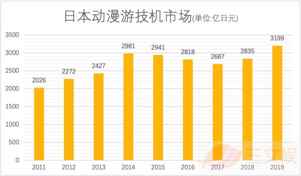 受参与人口减少的影响,2019年的市场规模比前一年减少了3.4%,缩小为1.3万亿(20万亿日元)。但是19年动画联动机器的市场规模却比去年增加了12.8%,约合202亿元(3,199亿日元),市场份额进一步扩大。