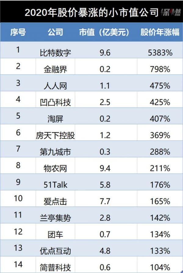 在前文中,我们在盘点涨幅最大的公司时,专门提到了“小市值公司”。这是一个神奇的群体,尤其是在疫情和美联储放水的背景下,很多妖股应运而生。我们把它们摘出来,放在这里单独讨论。