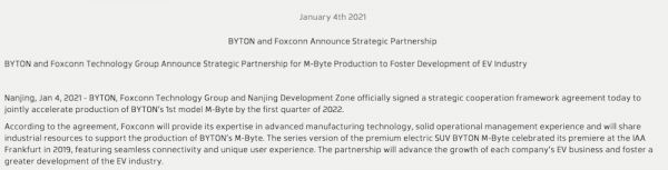 01. 拜腾宣布和富士康达成战略合作伙伴关系