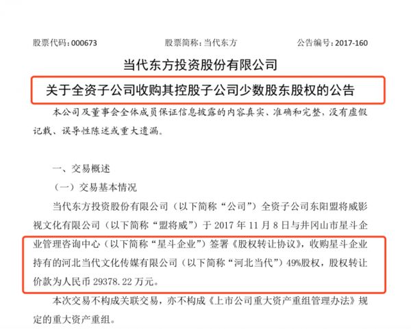 2017年11月8日,经董事会审议通过,当代东方全资子公司盟将威与星斗企业签署《股权转让协议》,以股权转让价款约2.94亿元收购星斗企业持有的河北传媒49%股权。此前,盟将威已持有河北传媒51%股权。