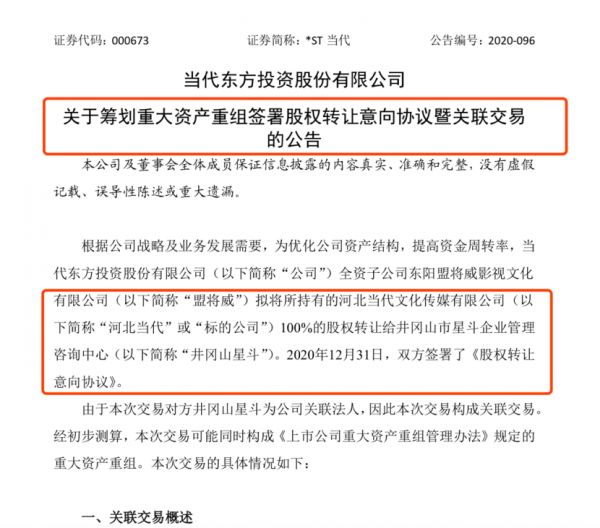 当代东方于12月31日公告,子公司盟将威拟将所持有的河北传媒100%的股权转让给星斗企业,双方于当日签署了《股权转让意向协议》。