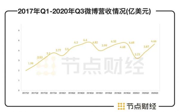 从2017年Q1-2020年Q3,微博的收入分别为:1.99亿美元、2.53亿美元、3.20亿美元、3.77亿美元、3.50亿美元、4.27亿美元、4.60亿美元、4.82亿美元、3.99亿美元、4.32亿美元、4.68亿美元、4.68亿美元、3.23亿美元、3.87亿美元、4.66亿美元;