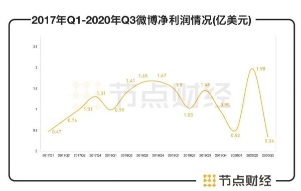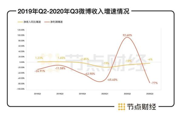 财报显示,2019年Q2-2020年Q3,微博净收入同比增速分别为1.23%、1.65%、-2.85%、-19%、-10%,-4%,总体呈下降态势;其净利润的表现也同样乏善可陈,同比增速分别为-26.91%、-11.58%、-42.90%、-65.4%、92.6%、-77%。