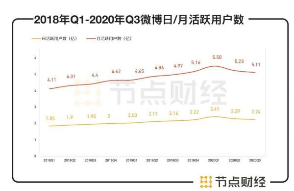 从2018年Q1-2020年Q3,微博的日活跃用户数为:1.84亿、1.90亿、1.95亿、2.00亿、2.03亿、2.11亿、2.16亿、2.22亿、2.41亿、2.29亿、2.24亿;同期月活跃用户数分别为:4.11亿、4.31亿、4.4亿、4.62亿、4.65亿、4.86亿、4.97亿、5.16亿、5.50亿、5.23亿、5.11亿。