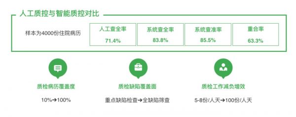 引入人工智能辅助质控半年后,东南大学附属中大医院拿了约4000份住院的病历,把人工质控和系统质控做了一个比较,中大医院病历缺陷查全率由人工质控时期的71.4%提升到了83%,查准率达到85%。