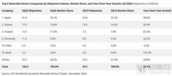 根据IDC发布的数据,2019年Q1排名前五的可穿戴厂商依次为苹果、小米、华为、三星和Fitbit。2020年Q3全球前五的格局变化并不大,只是排名上略有变化,排名前四的可穿戴设备厂商依次为苹果、小米、华为、三星,Fitbit和印度厂商BoAt则都以2.6%的市占率并列第五。