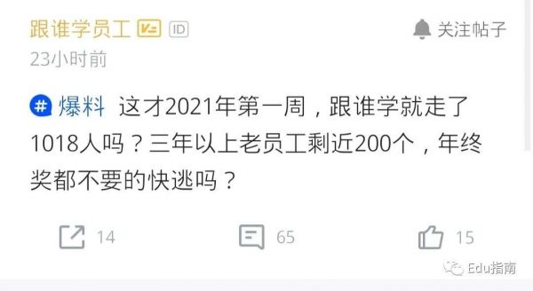 1月5日,职场社区脉脉上,有“跟谁学员工”透露:“2021年第一周,跟谁学就走了1018人”。