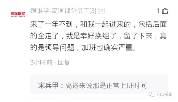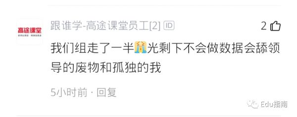在帖子下面,还有部分显示为“跟谁学-高途课堂员工”(跟谁学公司旗下-k12主要品牌)的回应,大致意思是所在组别离职人数“走了一半”、“差不多全走了”。