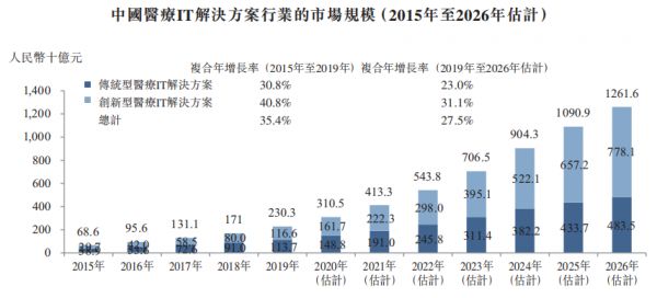 按收入计,中国创新型医疗IT解决方案的市场规模由2015年至2019年实现双位数增长,而其中创新型医疗IT解决方案的市场规模由2015年的人民币297亿元增至2019年的人民币1166亿元,复合年增长率为40 .8%,灼炽咨询预计将于2026年增至人民币7781亿元,2019年至2026年的复合年增长率为31.1%。
