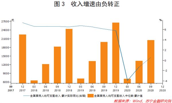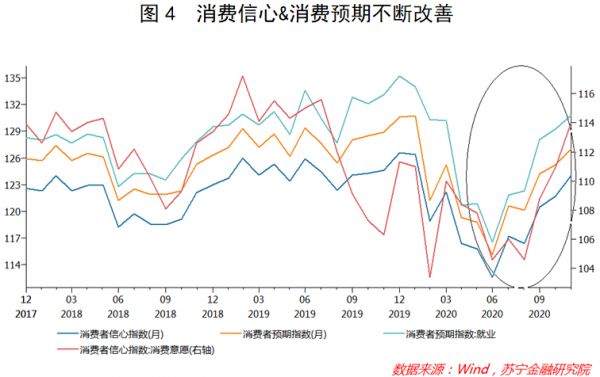 国民经济的回暖,带动了国人收入增速的反弹。从数据上看,全国居民人均可支配收入实际累计同比已在2020年第三季度实现了由负转正(见图3),同时人们的消费者信心以及对后续市场走势的预期都在日益改善,这将为消费需求的稳定与消费潜力的释放打下基础。