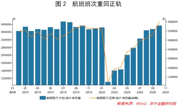 此后,随着国内疫情防控形势的日渐稳定与持续向好,各行各业复工复产、复商复市稳步推进,国人的跨省流动也不再受限,国民经济运行日益回归正常轨道,消费增长势头不断恢复,8月份就实现了社零当月同比增速的由负转正,累计同比的负增长幅度也在不断收窄,航班的班次也回到了疫情之前的水平,既彰显出我国经济发展的强大韧性,又反映出国人消费的巨大潜力(见图1、图2)。