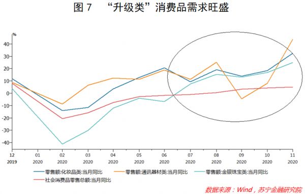 与此同时,偏高端领域的消费需求依然强烈。从数据上看,代表高品质消费的化妆品、通讯器材、金银珠宝等品类,零售额当月同比增速基本都显著高于社零总额(见图7),更加佐证了国人整体的消费升级态势。