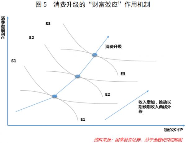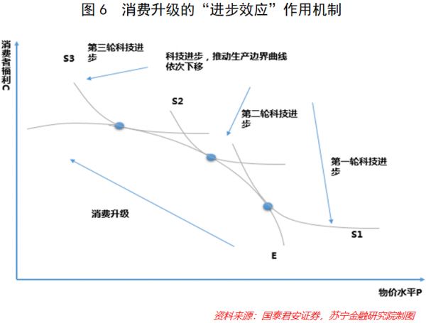 根据国泰君安证券的研究报告,使消费者福利提升的作用机制有二:一是居民收入增加而引致的“财富效应”,二是科技进步促使生产曲线变化,进而引致居民消费选择与消费方式变化的“进步效应”(参见图5、图6)。各种复杂的消费升级现象与市场行为,基本都可以从中找到合理的解释,而这也告诉我们,仅从商品价格或质量来判断消费的升级或降级,都是有失偏颇的。