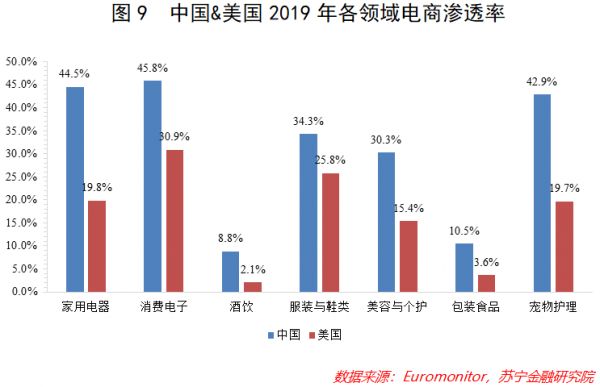 我们不妨以中美两国为例来加以对比。根据Euromonitor的统计数据,2019年中国在家用电器、消费电子、酒饮、服装与鞋类、美容与个护、包装食品、宠物护理多个领域的电商渗透率均显著高于美国(见图9),而差距的另一面,恰恰是提升空间的客观存在。