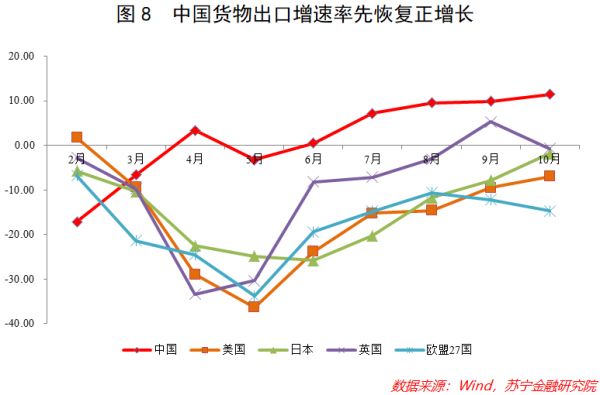 放眼全球,中国经济可谓一枝独秀,出口数据可以佐证这一点。Wind数据显示,自2020年第三季度起,中国的货物出口当月同比一直都呈正增长态势,反观美国、英国、日本、欧盟等经济体的出口,尚不能彻底摆脱疫情的困扰(见图8)。