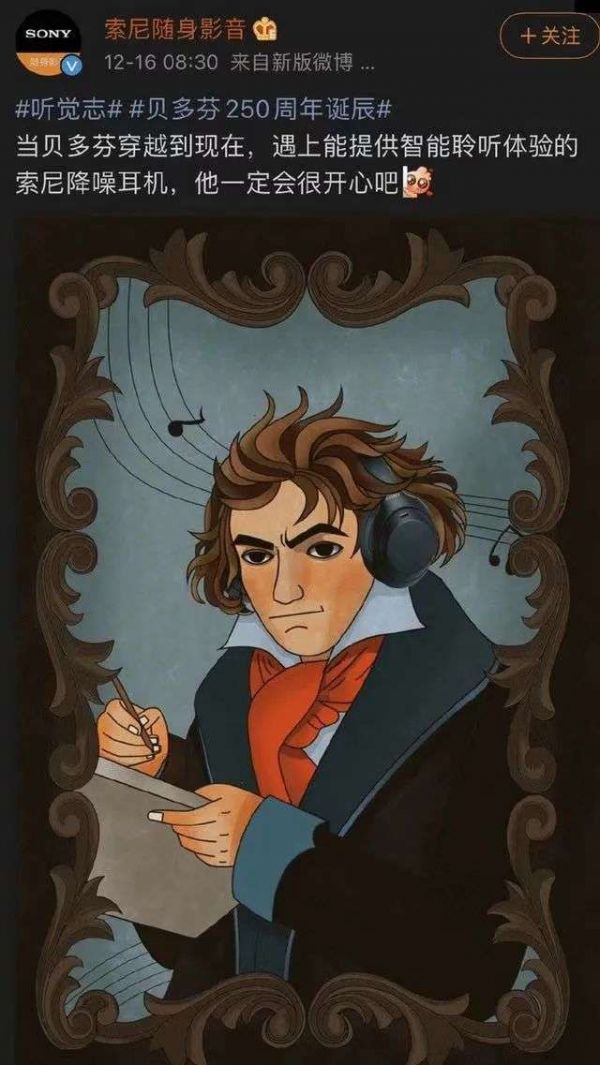 去年12月16日,贝多芬250周年诞辰当天,索尼随身影音官方微博决定要蹭一下贝多芬的热度,却惨遭翻车:给贝多芬这位听障患者戴上了索尼降噪耳机。