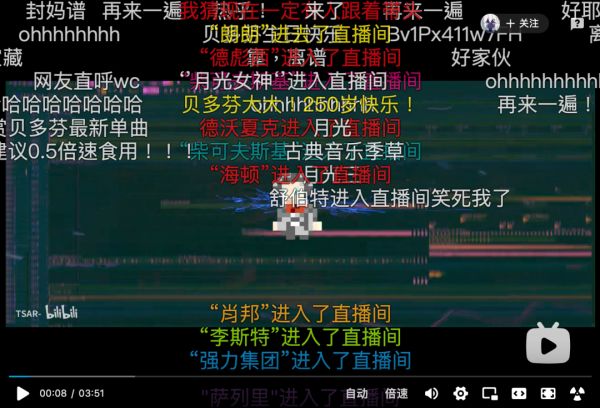 业内对贝多芬的推崇,和B站玩家对站内音乐区的热爱如出一辙。数据显示,B站古典音乐频道下的10.4万个视频被看了超过3亿次,UP主@绯绯Feifei的《贝多芬病毒》上线不过十天,观看量就超过了50万,UP主@TSAR-改编的《月光奏鸣曲》赛博朋克味十足,仅20天观看量就达到124万。