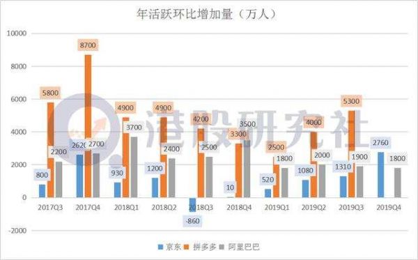 正是因为京东的迷茫,错过了"直播带货""短视频电商"的关键机会,而这也给了对手们反超的机会。数据显示,2017Q3-2019Q3,拼多多的单季增量用户在2500-5000万,阿里巴巴的单季增量用户在2000-3500万,而京东的单季增量用户仅1000万左右,并且在2018Q3和2018Q4用户增长停滞。