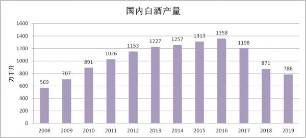 从总量上来说,白酒行业的产量在过去几年持续萎缩,根据国家统计局的数据,中国白酒产量在2016年达到1358万千升的历史性高点,随后便快速下滑。截至到2019年,降至786万千升,回到了十年前的水平。