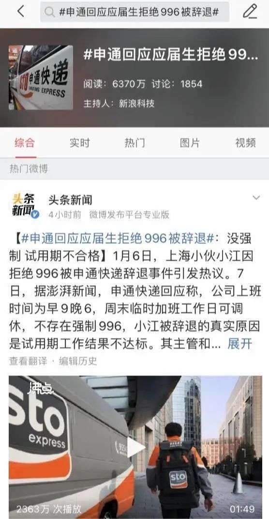 1月7日,一则“应届生拒绝996被申通快递辞退”的消息冲上了微博热搜。