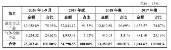 而禾赛科技的营收同样是靠激光雷达所支撑。招股书显示,2017年、2018年、2019年、2020年前九个月,禾赛科技激光雷达产品的营收分别为1433万元、1.28亿元、3.28亿元、1.9亿元,在总营收中的占比则分别为74.87%、96.69%、94.38%、75.38%。