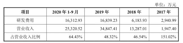 对此,禾赛科技在招股书中指出,存在未弥补亏损的主要原因是研发支出金额较高,且 2020 年受到新冠疫情的影响,部分客户的采购需求出现临时性放缓。据招股书显示,2017年、2018年、2019年、2020年前9个月禾赛科技的研发投入分别为 2941 万元、6184万元、1.68亿元及 1.63亿元,占营业收入比例分别为 151.02%、46.54%、48.32%及 64.43%。