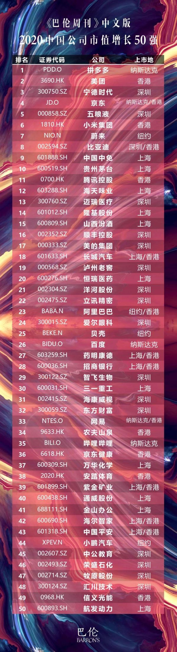 中国公司市值增长50强:拼多多、美团、宁德时代居前三