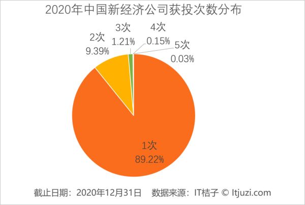 根据it桔子统计,2020年度国内共有3886家新经济公司获投,融资总额8145亿元。而在这块大蛋糕里面,56%的资金是被融资金额在10亿元以上的公司拿走的,但这样的公司只占获投公司的 4%,另外高达89%的公司在2020年仅获投1次。