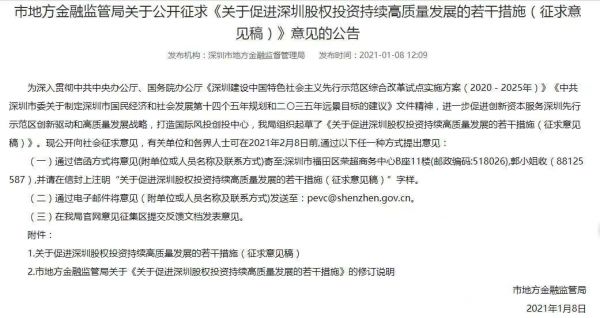 投资界消息,1月8日,深圳市地方金融监管局发布关于公开征求《关于促进深圳股权投资持续高质量发展的若干措施(征求意见稿)》的通知,公开向社会征求意见。