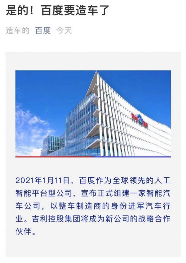 今天百度宣布正式组建一家智能汽车公司,以整车制造商的身份进军汽车行业。吉利控股集团将成为新公司的战略合作伙伴。