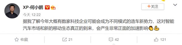 何小鹏今天也发微博说今年会有更多科技企业加入造车新势力。