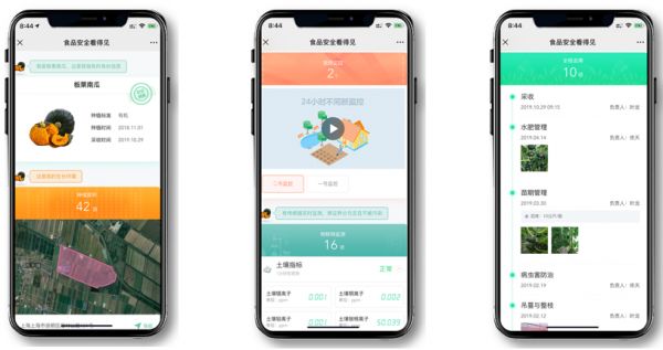 平台的上游主要是中大型农业生产基地,十万个农场主为其提供传感器、监控系统等农业物联网设备,建立农业大数据平台,并将溯源系统纳入其中,消费者扫描即可查询到农产品全生命周期的数据,查看采摘时间、种植地块、检测报告、农事操作和农场介绍等。如果基地已部署物联网硬件,消费者还可以观看农场实时视频监控和实时环境检测指标。