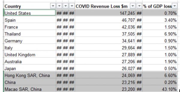 中国的旅游业同样遭受了严重损失,仅香港地区的损失就超过240亿美元,甚至高于中国大陆地区的231亿美元损失。澳门旅游业的损失金额与大陆地区的情况大致一样。