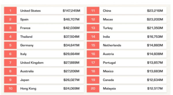 除了西班牙和法国,旅游业经济损失在全球排名前十的欧洲国家还有德国、意大利和英国,损失金额分别达346亿美元、297亿美元和279亿美元。旅游业亏损排名前二十的欧洲国家还包括土耳其、荷兰、奥地利和葡萄牙。全球Top 20里,欧洲国家就占据了共计9个席位。