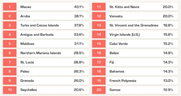 最近,签证申请服务公司ESTA引用了联合国世界旅游组织(UNWTO)和世界银行的数据,总结了旅游业收入损失最惨重20个的国家/地区,以及分别对GDP的影响。