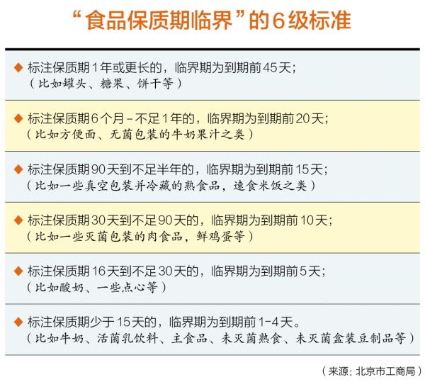 回过头来看中国,早在2012年,北京工商局也曾出台过“食品保质期临界”的6级标准,明确了离保质期多久的食品算临期。