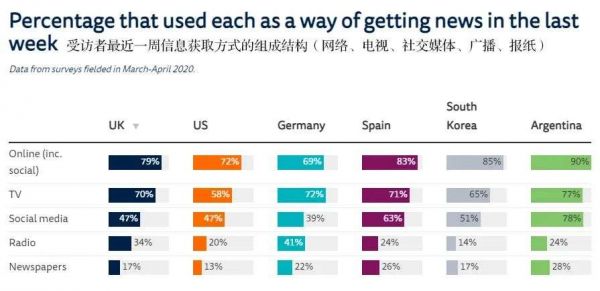 注:受访者获取新闻方式的组成结构,包括网络、电视、社交媒体、广播、报纸五大渠道(来源:Reuters Institute)