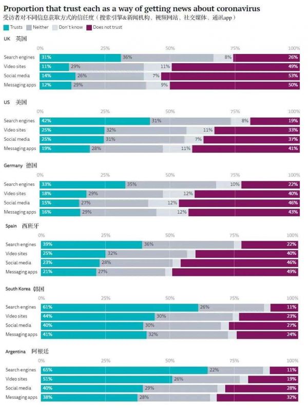 注:受访者对不同信息获取方式的信任度,涵盖搜索引擎&新闻机构、视频网站、社交媒体、通讯APP四大渠道(来源:Reuters Institute)