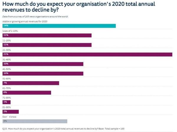 路透社2020年6月至2020年8月对165家新闻媒体组织进行调查研究,并对其中7家媒体进行访谈,研究发现,31%受访者认为自己所在的媒体机构收入下降幅度将超过30%,只有14%受访者认为自己所在的公司能够维持收支平衡甚至实现收入增长。