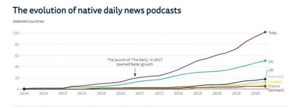 注:2014年到2020年“日更”新闻类播客数量变化趋势(来源:Reuters Institute)