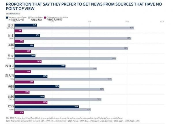 注:多数受访者偏爱从不带特定观点的中立性新闻机构获取信息(来源:Reuters Institute)