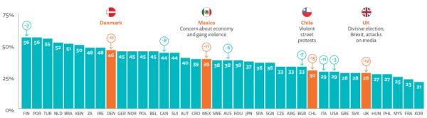 日益增长的不确定性和观念上的两极分化削弱了人们对公共新闻媒体的信任度。全球只有芬兰(56%)、葡萄牙(56%)、土耳其(55%)、荷兰(52%)、巴西(48%)、肯尼亚(48%)六个国家受访者对新闻信赖度超过50%,英国(28%)、匈牙利(27%)、菲律宾(27%)、马来西亚(25%)、法国(23%)、韩国(21%)排在末尾,不同国家民众对媒体的信任度存在较大差异。
