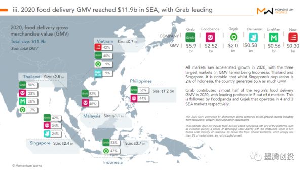 2020年,Grab贡献了该地区近一半的GMV,在东南亚6个市场中的5个中处于领先地位。紧随其后的是Foodpanda,该公司在东南亚4个国家开展业务,并贡献了该地区约20%的GMV,拥有印尼大约一半市场份额的Gojek位居第三。